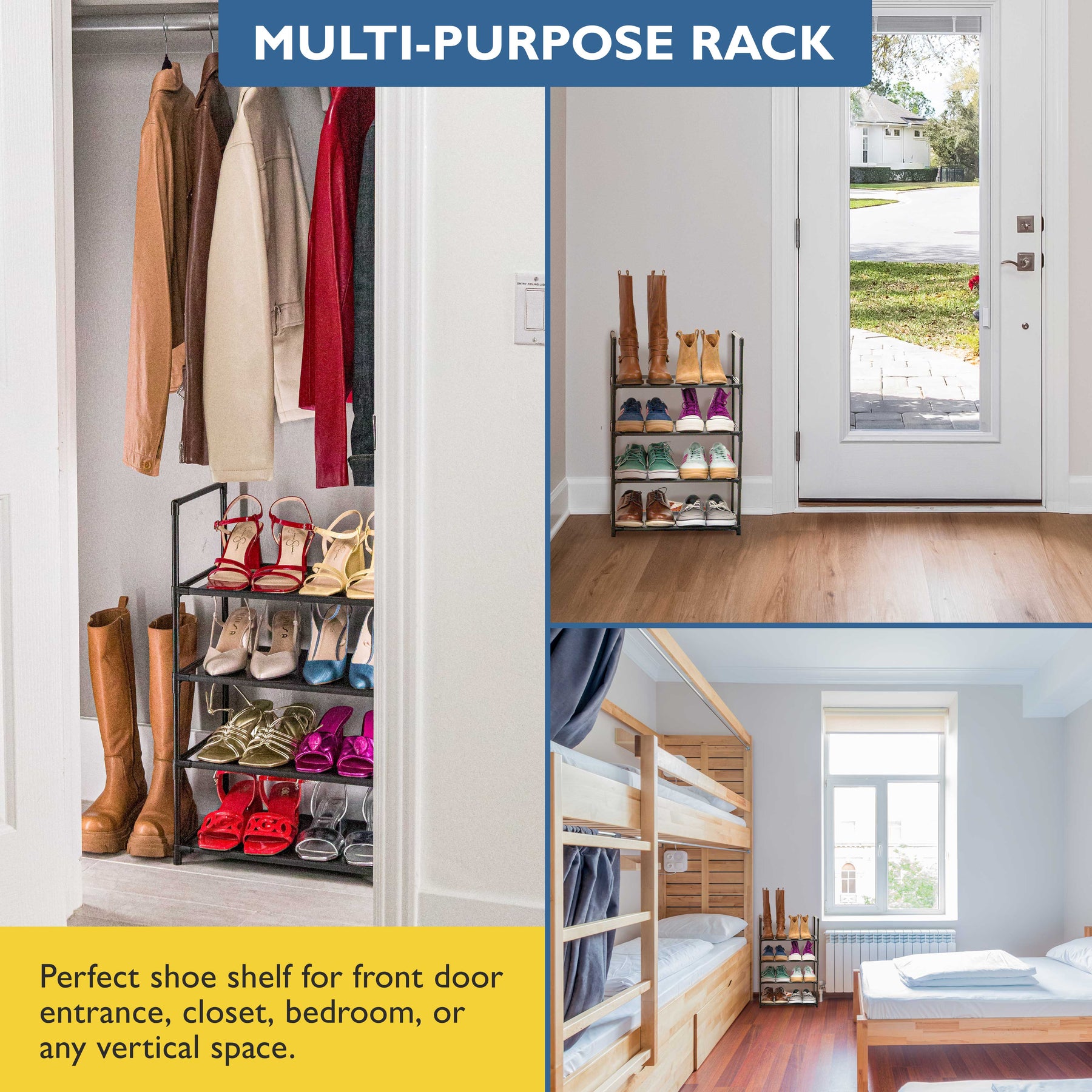 Stackable and Versatile: Stack multiple shoe racks for expanded storage or detach a tier for added space. Customizable closet shoe organizer for heels, boots, sneakers, and sandals for both men and women.